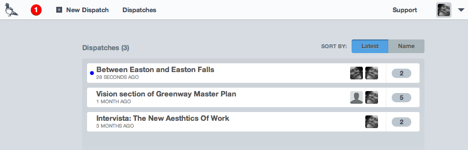 Rather than a task- or project-centered take on collaborative work, dispatch is oriented to document collaboration. A user creates a ‘dispatch’, document folder, and can share that with collaborators. Below is my list of dispatches. The blue dot indicates that Between Easton And Easton Falls has new updates, and the red circle with the one means I have notifications waiting.